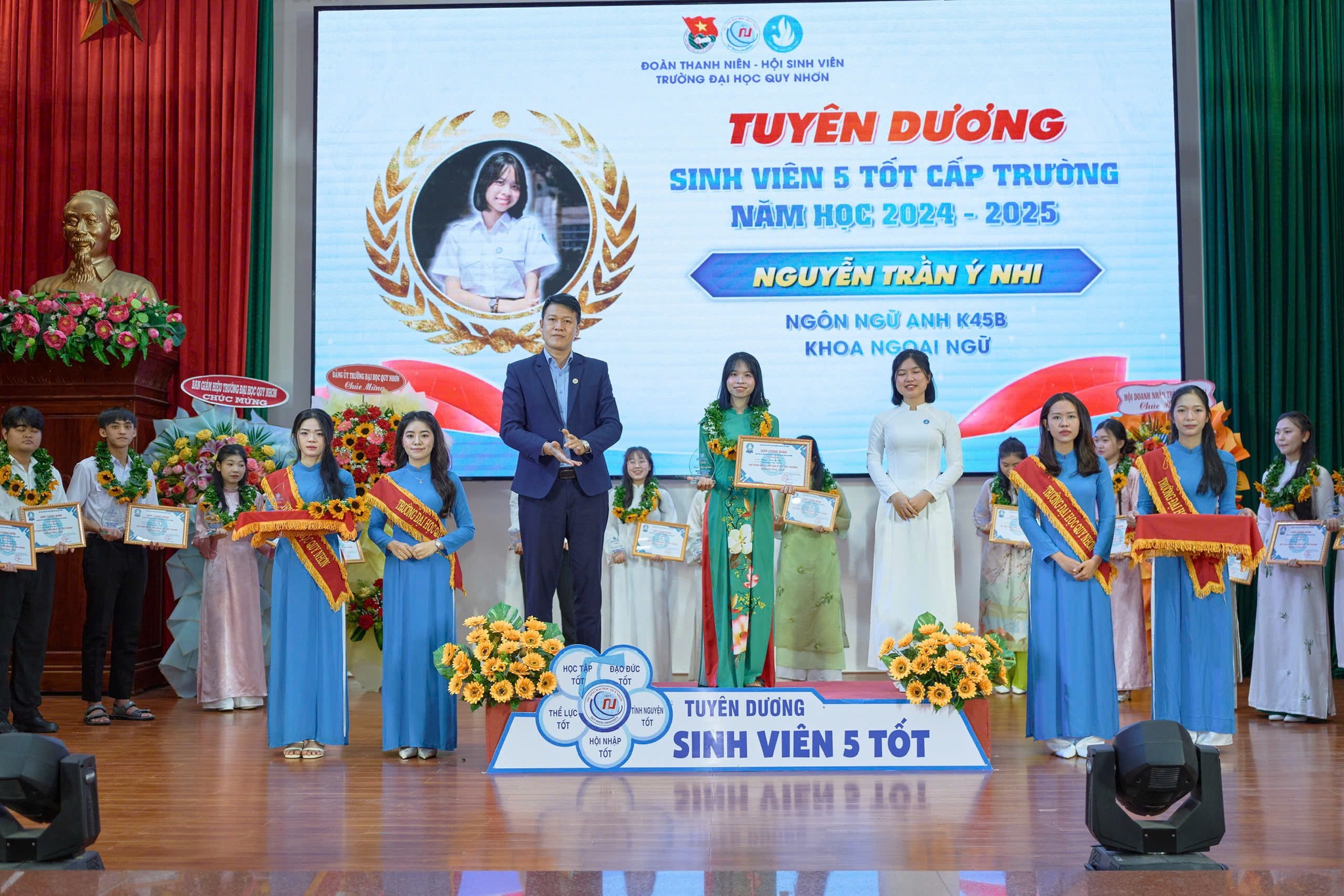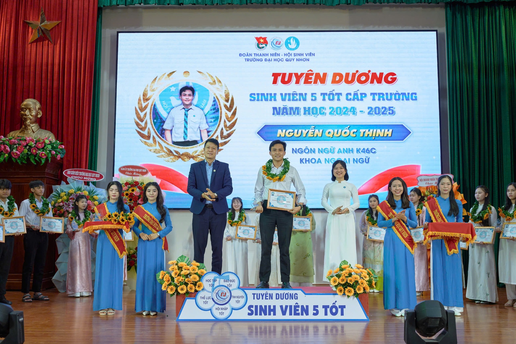 không khí hân hoan của Chương trình Kỷ niệm 76 năm Ngày truyền thống Học sinh – Sinh viên Việt Nam (09/01/1950 – 09/01/2026) và Tuyên dương danh hiệu “Sinh viên 5 Tốt” do Hội Sinh viên Trường Đại học Quy Nhơn tổ chức, Khoa Ngoại ngữ vô cùng tự hào khi có 03 sinh viên tiêu biểu không chỉ đạt danh hiệu Sinh viên 5 Tốt cấp Trường mà còn được vinh danh ở cấp Tỉnh.