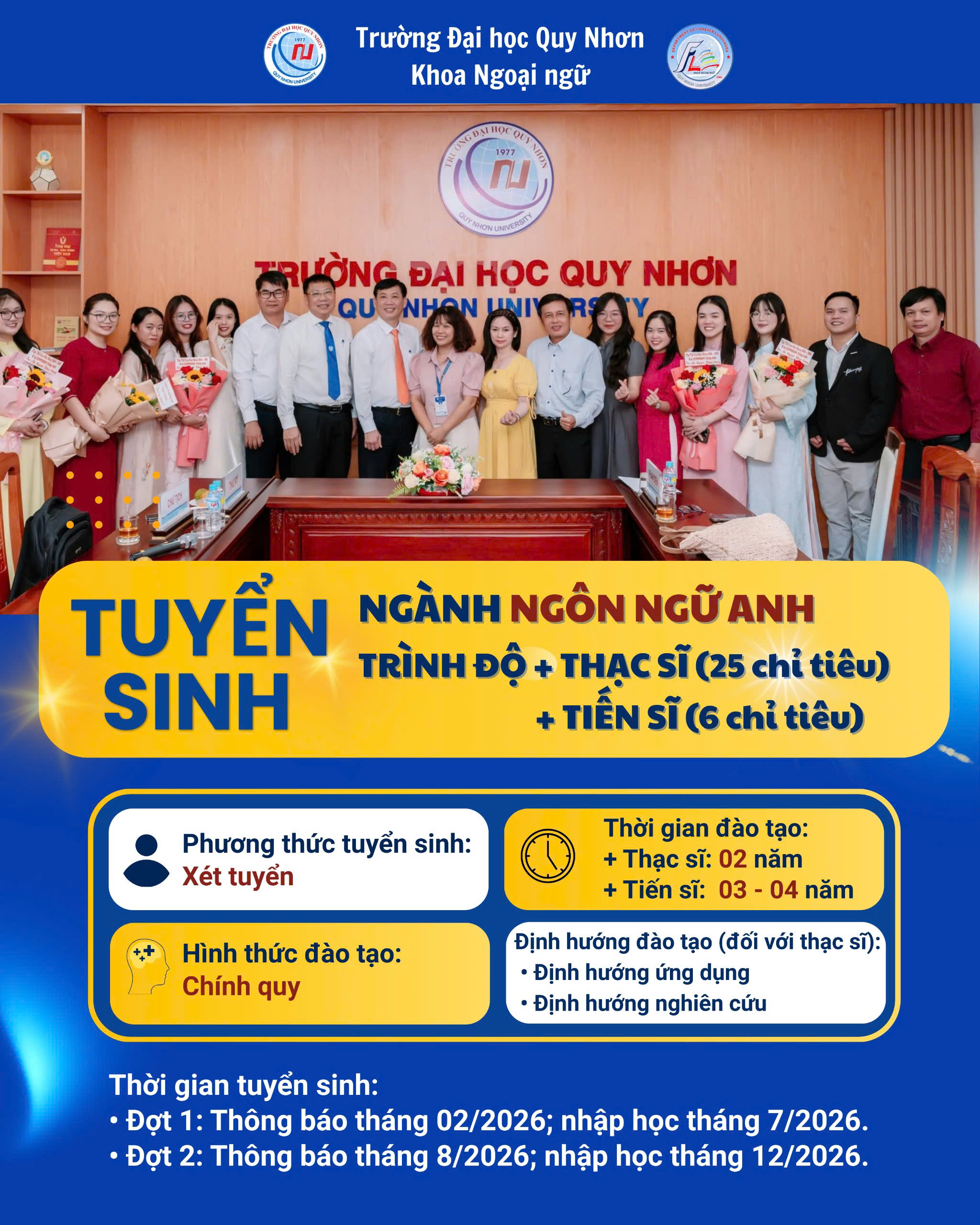 Khoa Ngoại ngữ – Trường Đại học Quy Nhơn thông báo tuyển sinh trình độ thạc sĩ và tiến sĩ ngành Ngôn ngữ Anh năm 2026 theo Kế hoạch tuyển sinh của Trường Đại học Quy Nhơn, cụ thể như sau: